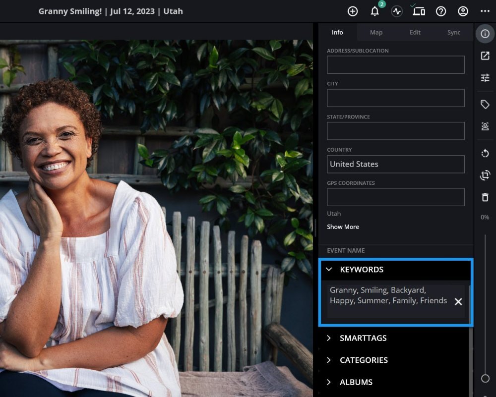 Add or edit keywords in the Keywords field for a single photo, or click the Edit Keywords button for multiple photos.