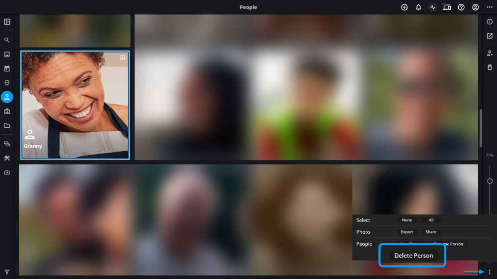 to access the Actions menu, then choose People > Delete Person. This will delete that tag from your library but will not delete any photos or other media.