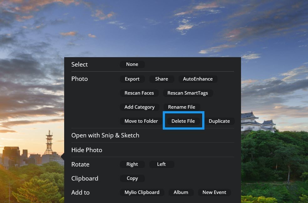 Select Photo > Delete File(s) to permanently delete the file(s) from your Mylio Photos Library and file system.