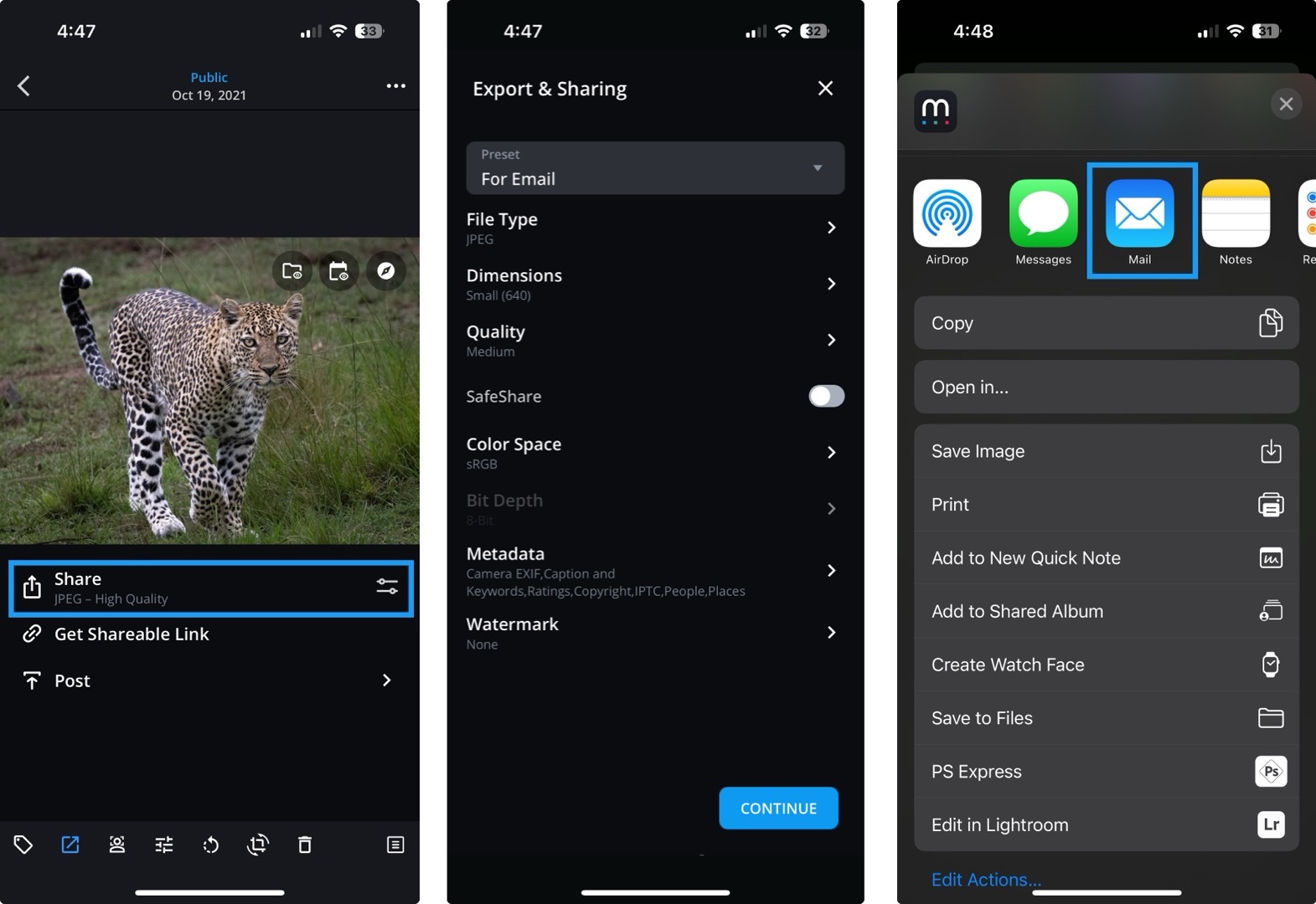 3. The first time you share on your mobile device, you’ll be prompted to choose an export preset or manually select your export options (file format, size, etc.). These settings will be saved as the default for future exports. If you need to adjust them for any export, tap the settings icon , make any necessary adjustments, then click Continue.