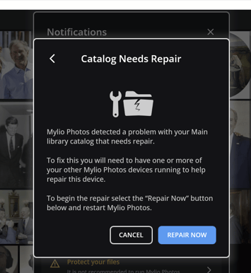 Error Notification: "The Mylio Photos Catalog on this device needs to be repaired."