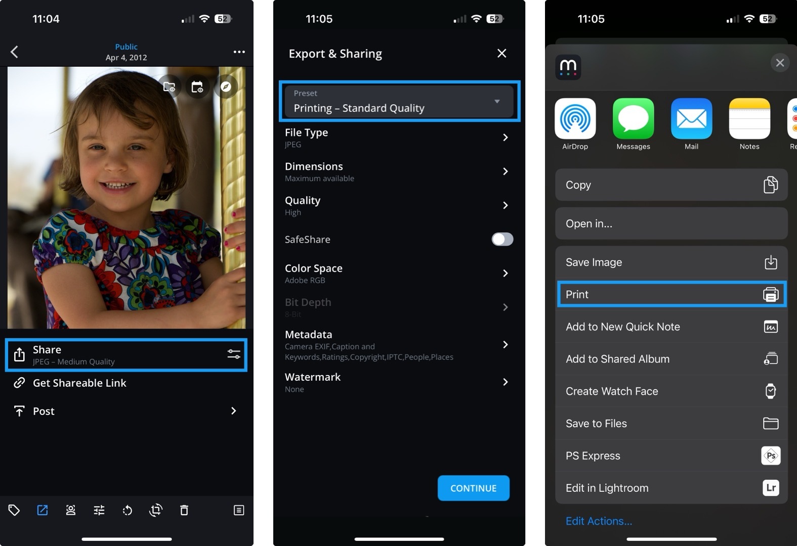 The first time you share on your mobile device, you’ll be prompted to choose an export preset or manually select your export options (file format, size, etc.). These settings will be saved as the default for future exports. If you need to adjust them for any export, tap the settings icon