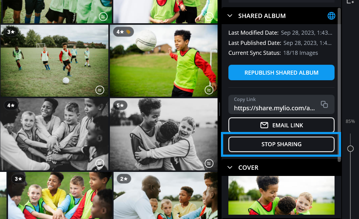 Click the Stop Sharing button to unpublish your Shared Album from the Internet. This will not remove it from your Mylio Photos Library.