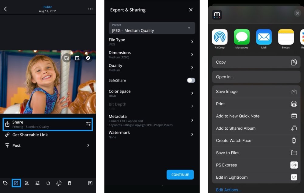 3. The first time you share on your mobile device, you’ll be prompted to choose an export preset or manually select your export options (file format, size, etc.). These settings will be saved as the default for future exports. If you need to adjust them for any export, tap the settings icon , make any necessary adjustments, then click Continue.