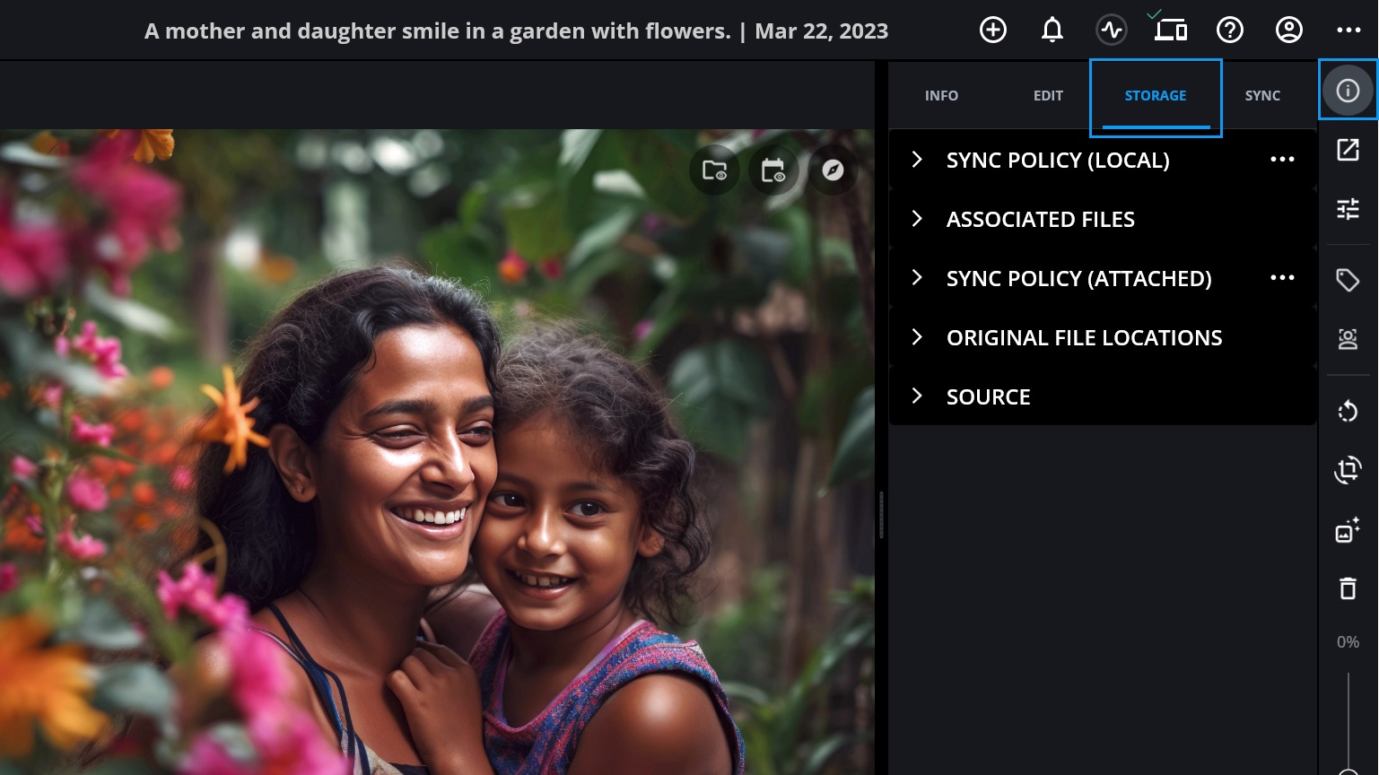 To access the Storage Panel, select a single image, then click the info icon at the top of the right sidebar to reveal the right panel, then select the Storage tab.